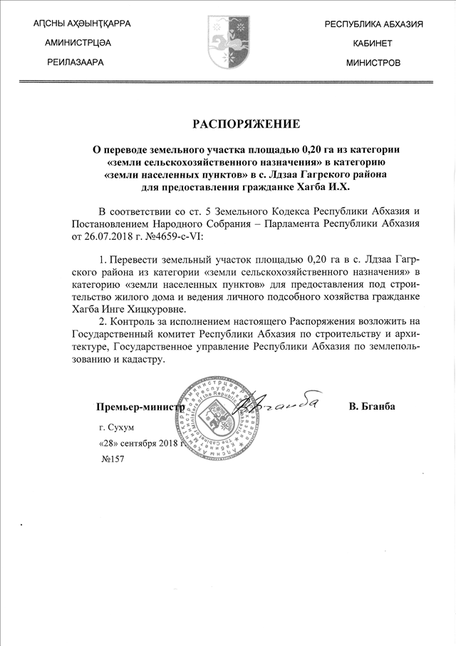 Распоряжение Кабинета Министров Республики Абхазия от 28.09.2018 № 157 "О переводе земельного участка площадью 0,20 га из категории "земли сельскохозяйственного назначения" в категорию "земли населенных пунктов" в с. Лдзаа Гагрского района для предоставления гражданке Хагба И.Х."