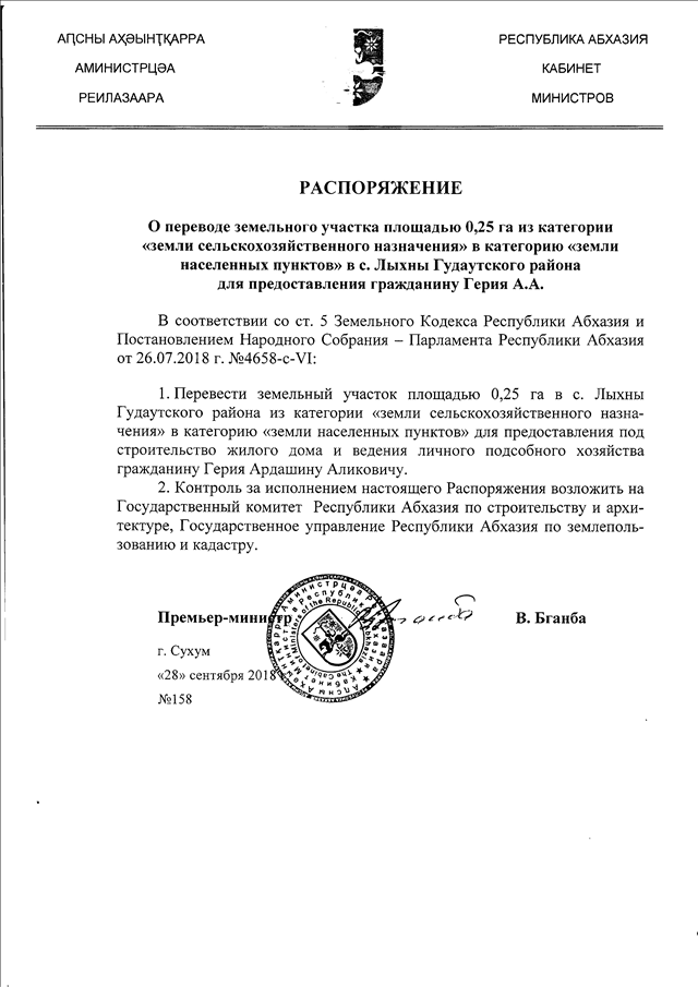 Распоряжение Кабинета Министров Республики Абхазия от 28.09.2018 № 158 "О переводе земельного участка площадью 0,25 га из категории "земли сельскохозяйственного назначения" в категорию "земли населенных пунктов" в с. Лыхны Гудаутского района для предоставления гражданину Герия А.А."