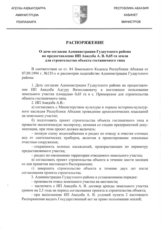 Распоряжение Кабинета Министров Республики Абхазия от 28.09.2018 № 159 "О даче согласия Администрации Гудаутского района на предоставление ИП Авидзба А.В. 0,65 га земли для строительства объекта гостиничного типа"