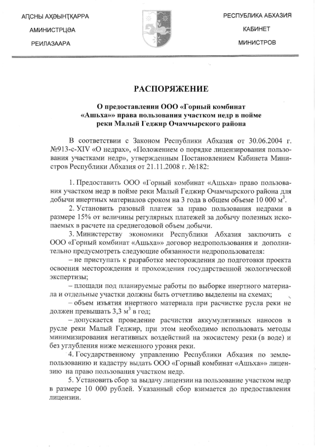 Распоряжение Кабинета Министров Республики Абхазия от 28.09.2018 № 162 "О предоставлении ООО "Горный комбинат "Ашьха" права пользования участком недр в пойме реки Малый Геджир Очамчырского района"