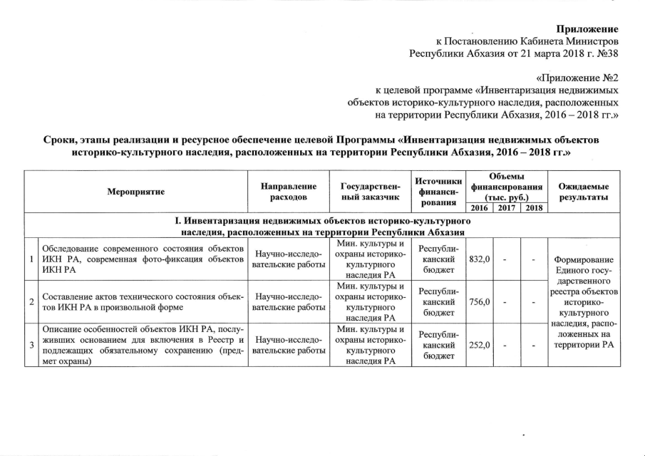 Постановление Кабинета Министров Республики Абхазия от 21.03.2018 № 38 "О внесении изменений в целевую программу "Инвентаризация недвижимых объектов историко-культурного наследия, расположенных на территории Республики Абхазия, 2016-2018 гг.", утвержденную Постановлением Кабинета Министров Республики Абхазия от 10 декабря 2015 г. № 171"