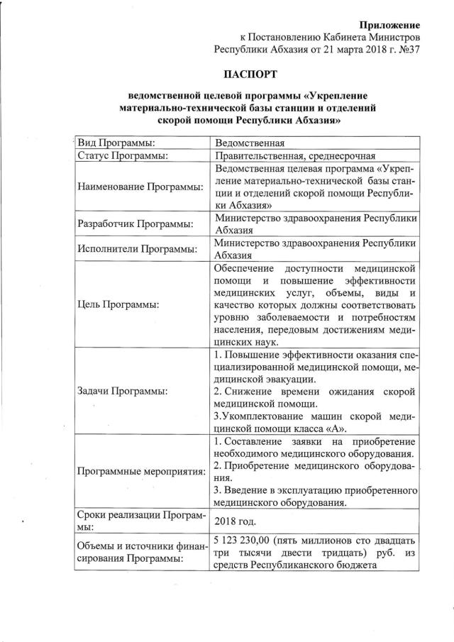 Постановление Кабинета Министров Республики Абхазия от 21.03.2018 № 37 "Об утверждении ведомственной целевой программы "Укрепление материально-технической базы станции и отделений скорой помощи Республики Абхазия"