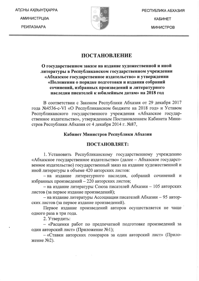 Постановление Кабинета Министров Республики Абхазия от 21.03.2018 № 41 "О государственном заказе на издание художественной и иной литературы в Республиканском государственном учреждении "Абхазское государственное издательство" и утверждении "Положения о порядке подготовки и издания собраний сочинений, избранных произведений и литературного наследия писателей к юбилейным датам" на 2018 год"