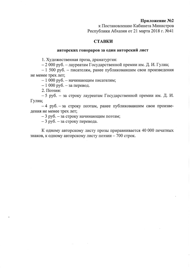 Постановление Кабинета Министров Республики Абхазия от 21.03.2018 № 41 "О государственном заказе на издание художественной и иной литературы в Республиканском государственном учреждении "Абхазское государственное издательство" и утверждении "Положения о порядке подготовки и издания собраний сочинений, избранных произведений и литературного наследия писателей к юбилейным датам" на 2018 год"