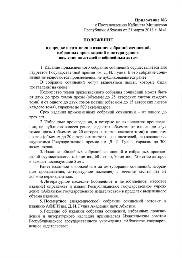 Постановление Кабинета Министров Республики Абхазия от 21.03.2018 № 41 "О государственном заказе на издание художественной и иной литературы в Республиканском государственном учреждении "Абхазское государственное издательство" и утверждении "Положения о порядке подготовки и издания собраний сочинений, избранных произведений и литературного наследия писателей к юбилейным датам" на 2018 год"