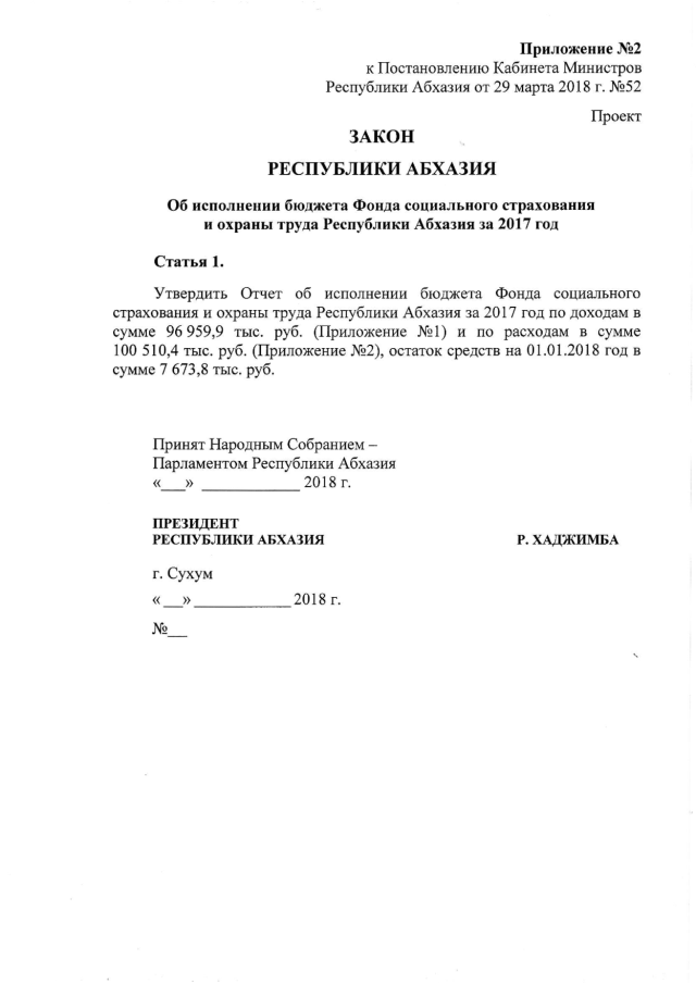 Постановление Кабинета Министров Республики Абхазия от 29.03.2018 № 52 "Об исполнении бюджета Фонда социального страхования и охраны труда Республики Абхазия за 2017 год"