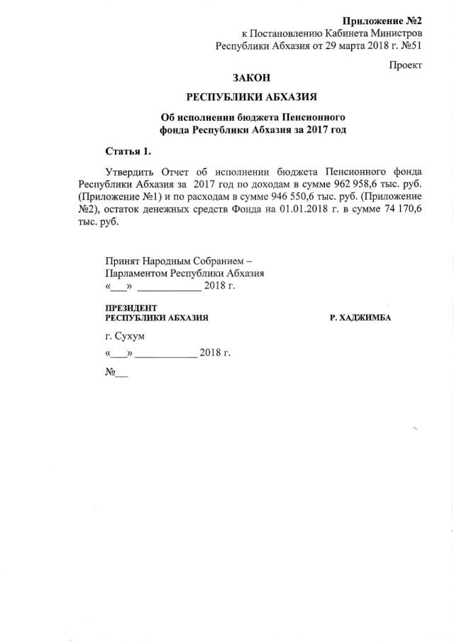 Постановление Кабинета Министров Республики Абхазия от 29.03.2018 № 51 "Об исполнении бюджета Пенсионного фонда Республики Абхазия за 2017 год"