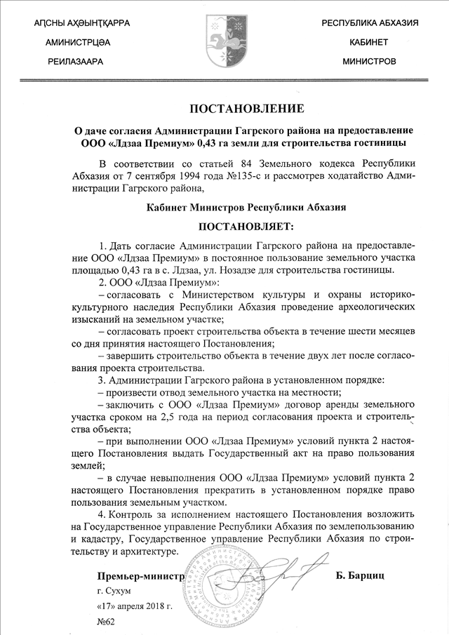 Постановление Кабинета Министров Республики Абхазия от 17.04.2018 № 62 "О даче согласия Администрации Гагрского района на предоставление ООО "Лдзаа Премиум" 0,43 га земли для строительства гостиницы"