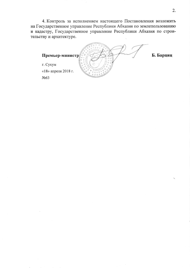Постановление Кабинета Министров Республики Абхазия от 18.04.2018 № 63 "О переводе земельного участка площадью 1,25 га в г. Новый Афон из категории "земли сельскохозяйственного назначения" в категорию "земли рекреационного назначения" для предоставления ИП Отырба Р. М. в постоянное пользование под строительство санаторно-курортного объекта"