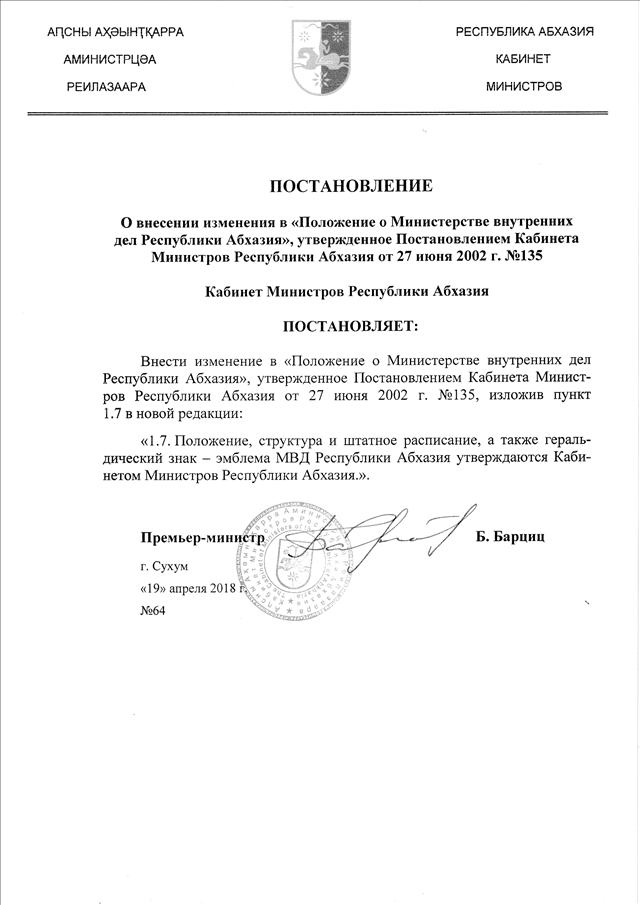 Постановление Кабинета Министров Республики Абхазия от 19.04.2018 № 64 "О внесении изменения в "Положение о Министерстве внутренних дел Республики Абхазия", утвержденное Постановлением Кабинета Министров Республики Абхазия от 27 июня 2002 г. № 135"