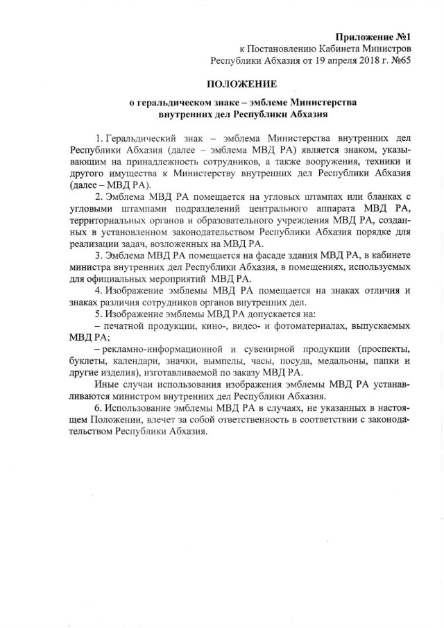Постановление Кабинета Министров Республики Абхазия от 19.04.2018 № 65 "О геральдическом знаке - эмблеме Министерства внутренних дел Республики Абхазия"