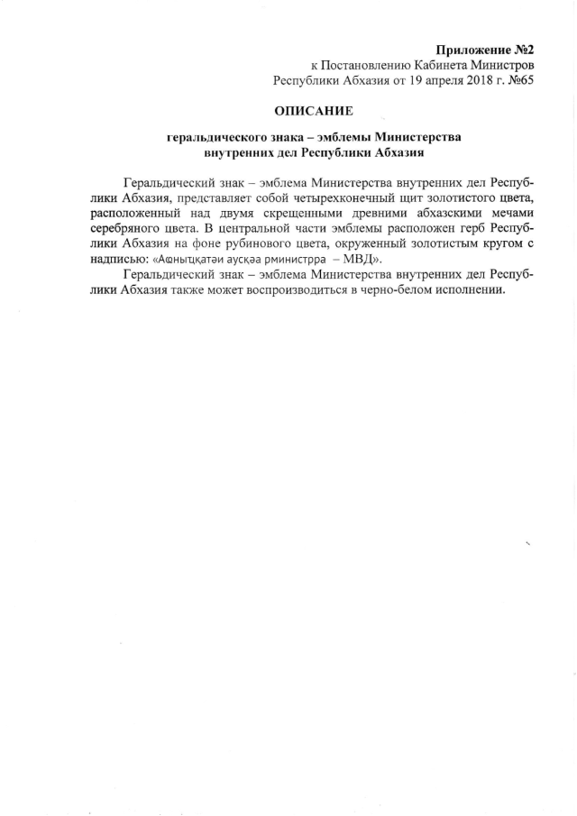 Постановление Кабинета Министров Республики Абхазия от 19.04.2018 № 65 "О геральдическом знаке - эмблеме Министерства внутренних дел Республики Абхазия"