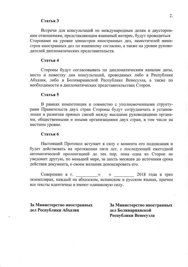Постановление Кабинета Министров Республики Абхазия от 31.05.2018 № 70 "О подписании Протокола о консультациях между Министерством иностранных дел Республики Абхазия и Министерством иностранных дел Боливарианской Республики Венесуэла"