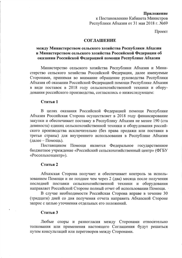 Постановление Кабинета Министров Республики Абхазия от 31.05.2018 № 69 "О проекте Соглашения между Министерством сельского хозяйства Республики Абхазия и Министерством сельского хозяйства Российской Федерации об оказании Российской Федерацией помощи Республике Абхазия"