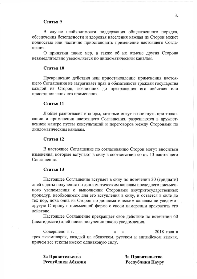 Постановление Кабинета Министров Республики Абхазия от 31.05.2018 № 71 "О заключении Соглашения между Правительством Республики Абхазия и Правительством Республики Науру об отказе от визовых формальностей при взаимных поездках граждан двух государств"