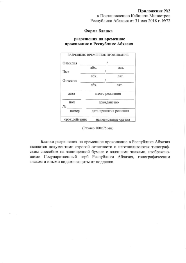 Постановление Кабинета Министров Республики Абхазия от 31.05.2018 № 72 "Об утверждении порядка выдачи иностранным гражданам и лицам без гражданства разрешения на временное проживание в Республике Абхазия, формы бланка разрешения на временное проживание, формы заявления о выдаче разрешения на временное проживание в Республике Абхазия"