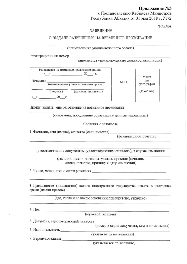 Постановление Кабинета Министров Республики Абхазия от 31.05.2018 № 72 "Об утверждении порядка выдачи иностранным гражданам и лицам без гражданства разрешения на временное проживание в Республике Абхазия, формы бланка разрешения на временное проживание, формы заявления о выдаче разрешения на временное проживание в Республике Абхазия"