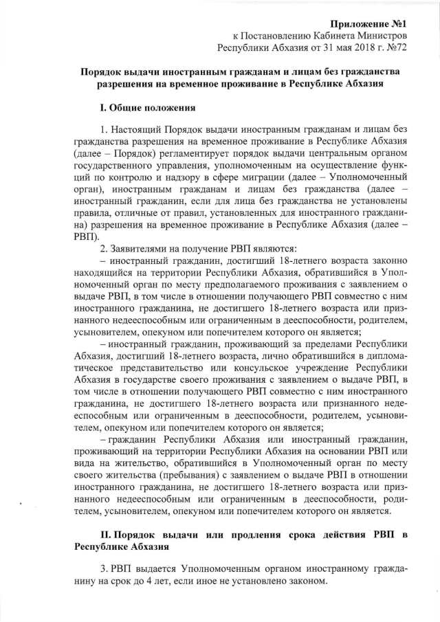Постановление Кабинета Министров Республики Абхазия от 31.05.2018 № 72 "Об утверждении порядка выдачи иностранным гражданам и лицам без гражданства разрешения на временное проживание в Республике Абхазия, формы бланка разрешения на временное проживание, формы заявления о выдаче разрешения на временное проживание в Республике Абхазия"