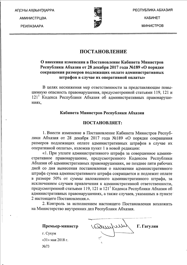 Постановление Кабинета Министров Республики Абхазия от 31.05.2018 № 73 "О внесении изменения в Постановление Кабинета Министров Республики Абхазия от 28 декабря 2017 года № 189 "О порядке сокращения размеров подлежащих оплате административных штрафов в случае их оперативной оплаты"