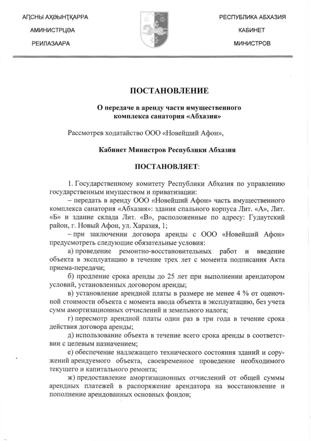 Постановление Кабинета Министров Республики Абхазия от 29.06.2018 № 85 "О передаче в аренду части имущественного комплекса санатория "Абхазия"