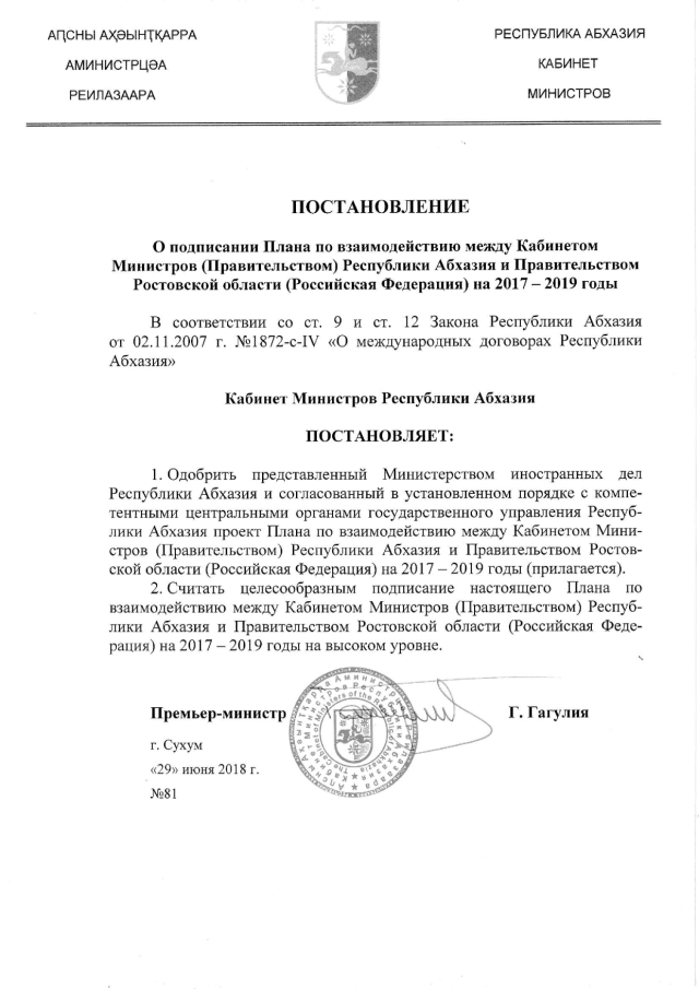 Постановление Кабинета Министров Республики Абхазия от 29.06.2018 № 81 "О подписании Плана по взаимодействию между Кабинетом Министров (Правительством) Республики Абхазия и Правительством Ростовской области (Российская Федерация) на 2017-2019 годы"