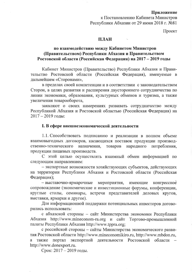 Постановление Кабинета Министров Республики Абхазия от 29.06.2018 № 81 "О подписании Плана по взаимодействию между Кабинетом Министров (Правительством) Республики Абхазия и Правительством Ростовской области (Российская Федерация) на 2017-2019 годы"