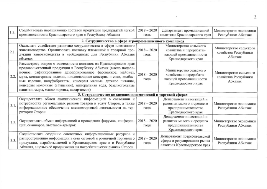 Постановление Кабинета Министров Республики Абхазия от 29.06.2018 № 80 "Об одобрении Программы мероприятий на 2018-2020 годы по реализации Соглашения между Правительством Республики Абхазия и Администрацией Краснодарского края (Российская Федерация) о торгово-экономическом, научно-техническом, гуманитарном и культурном сотрудничестве от 28.07.2009 г."