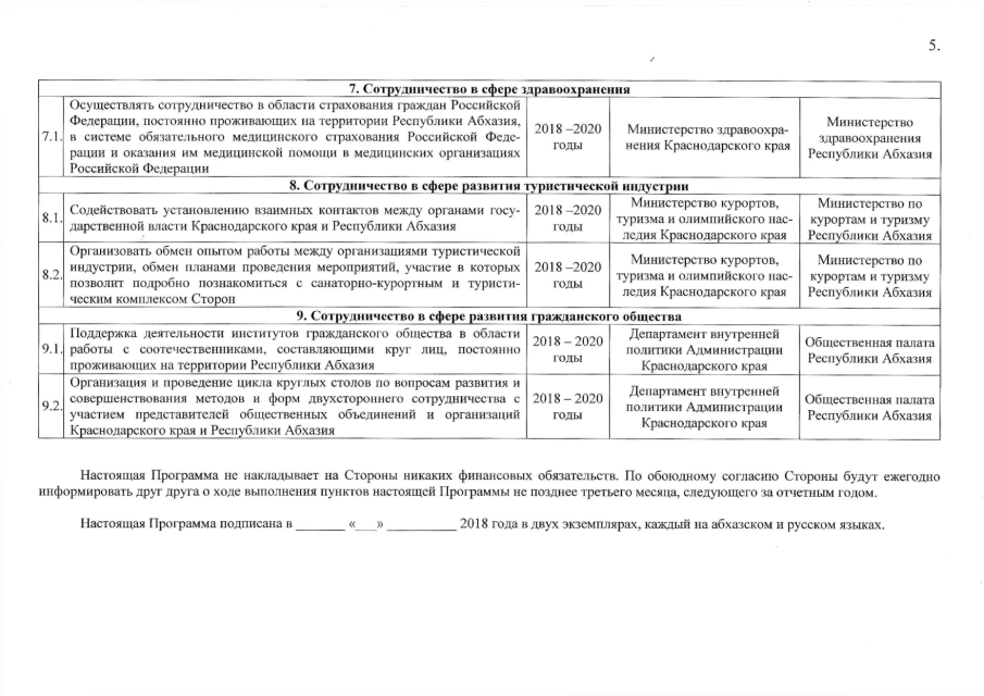 Постановление Кабинета Министров Республики Абхазия от 29.06.2018 № 80 "Об одобрении Программы мероприятий на 2018-2020 годы по реализации Соглашения между Правительством Республики Абхазия и Администрацией Краснодарского края (Российская Федерация) о торгово-экономическом, научно-техническом, гуманитарном и культурном сотрудничестве от 28.07.2009 г."
