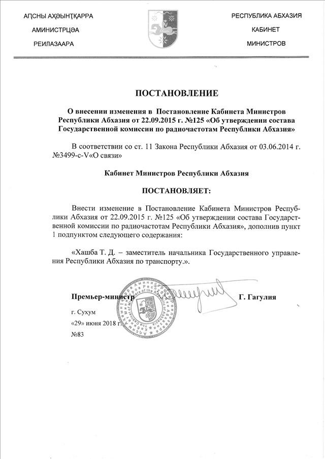 Постановление Кабинета Министров Республики Абхазия от 29.06.2018 № 83 "О внесении изменения в Постановление Кабинета Министров Республики Абхазия от 22.09.2015 г. № 125 "Об утверждении состава Государственной комиссии по радиочастотам Республики Абхазия"