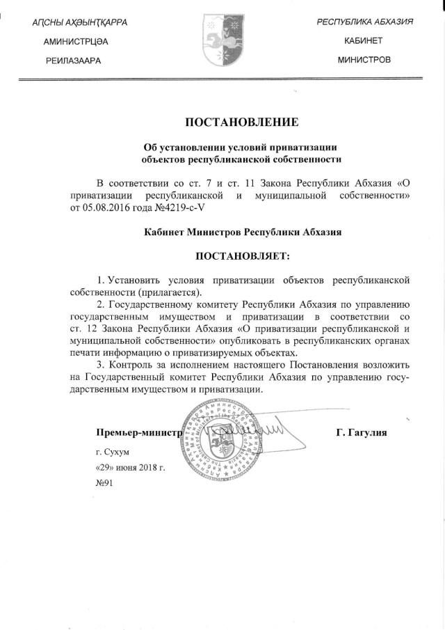 Постановление Кабинета Министров Республики Абхазия от 29.06.2018 № 91 "Об установлении условий приватизации объектов республиканской собственности"