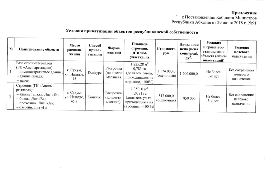 Постановление Кабинета Министров Республики Абхазия от 29.06.2018 № 91 "Об установлении условий приватизации объектов республиканской собственности"