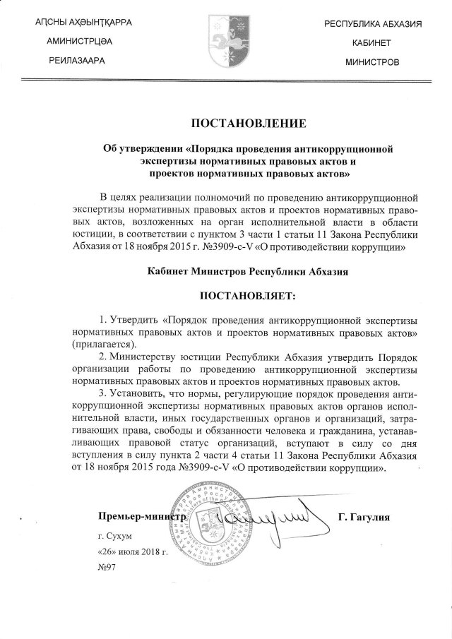 Постановление Кабинета Министров Республики Абхазия от 26.07.2018 № 97 "Об утверждении "Порядка проведения антикоррупционной экспертизы нормативных правовых актов и проектов нормативных правовых актов"