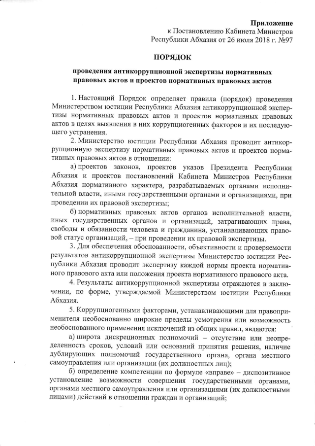 Постановление Кабинета Министров Республики Абхазия от 26.07.2018 № 97 "Об утверждении "Порядка проведения антикоррупционной экспертизы нормативных правовых актов и проектов нормативных правовых актов"