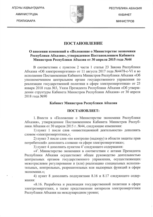 Постановление Кабинета Министров Республики Абхазия от 26.07.2018 № 98 "О внесении изменений в "Положение о Министерстве экономики Республики Абхазия", утвержденное Постановлением Кабинета Министров Республики Абхазия от 30 апреля 2015 года № 44"