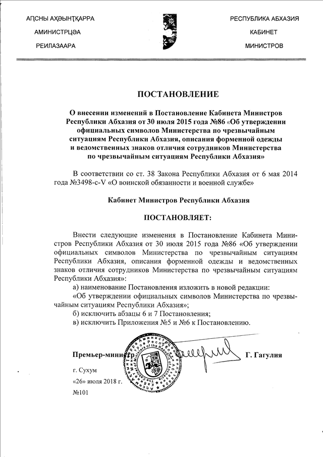 Постановление Кабинета Министров Республики Абхазия от 26.07.2018 № 101 "О внесении изменений в Постановление Кабинета Министров Республики Абхазия от 30 июля 2015 года № 86 "Об утверждении официальных символов Министерства по чрезвычайным ситуациям Республики Абхазия, описания форменной одеады и ведомственных знаков отличия сотрудников Министерства по чрезвычайным ситуациям Республики Абхазия"