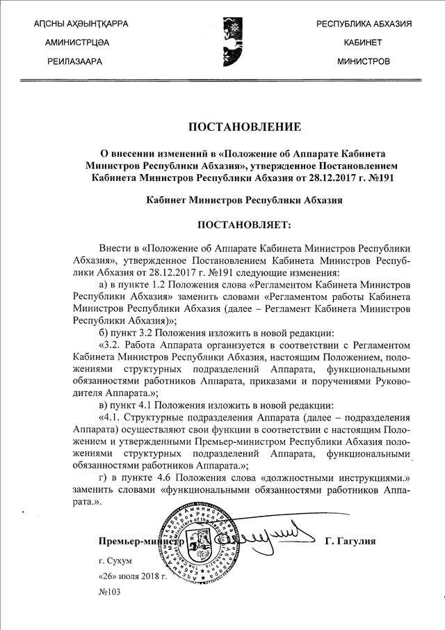 Постановление Кабинета Министров Республики Абхазия от 26.07.2018 № 103 "О внесении изменений в "Положение об Аппарате Кабинета Министров Республики Абхазия", утвержденное Постановлением Кабинета Министров Республики Абхазия от 28.12.2017 г. № 191"