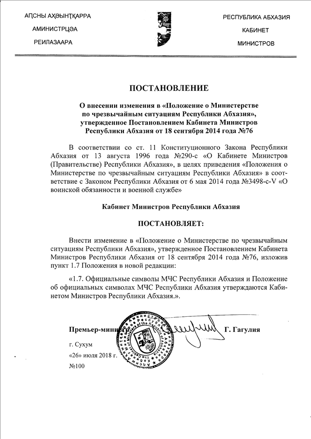 Постановление Кабинета Министров Республики Абхазия от 26.07.2018 № 100 "О внесении изменения в "Положение о Министерстве по чрезвычайным ситуациям Республики Абхазия", утвержденное Постановлением Кабинета Министров Республики Абхазия от 18 сентября 2014 года № 76"