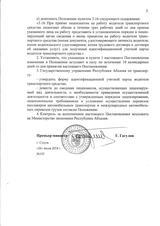Постановление Кабинета Министров Республики Абхазия от 26.07.2018 № 105 "О внесении изменений в "Положение о лицензировании деятельности по перевозкам пассажиров автомобильным транспортом, международным автомобильным перевозкам грузов (за исключением случаев, если указанная деятельность осуществляется для обеспечения собственных нужд юридического лица или индивидуального предпринимателя)", утвержденное Постановлением Кабинета Министров Республики Абхазия от 16 июня 2016 года № 104"