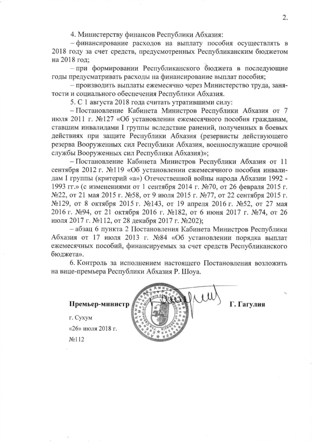 Постановление Кабинета Министров Республики Абхазия от 26.07.2018 № 112 "Об установлении ежемесячного пособия инвалидам I группы Отечественной войны народа Абхазии 1992-1993 гг. и лицам, ставшим инвалидами I группы вследствие ранений, полученных в боевых действиях при защите Республики Абхазия (резервисты действующего резерва Вооруженных сил Республики Абхазия, военнослужащие срочной службы Вооруженных сил Республики Абхазия)"
