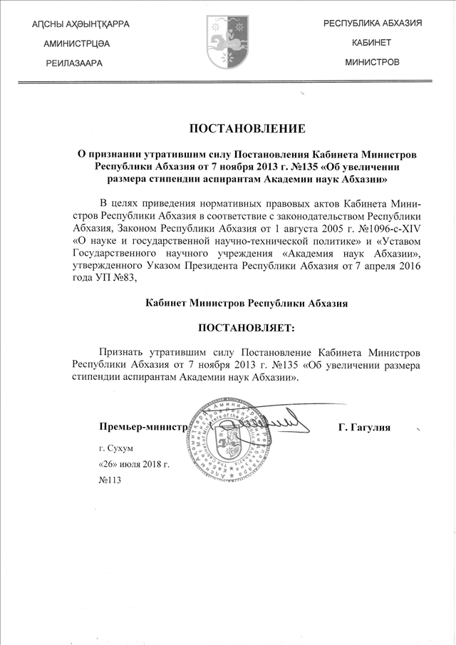 Постановление Кабинета Министров Республики Абхазия от 26.07.2018 № 113 "О признании утратившим силу Постановления Кабинета Министров Республики Абхазия от 7 ноября 2013 г. № 135 "Об увеличении размера стипендии аспирантам Академии наук Абхазии"