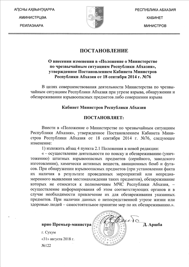 Постановление Кабинета Министров Республики Абхазия от 31.08.2018 № 122 "О внесении изменения в "Положение о Министерстве по чрезвычайным ситуациям Республики Абхазия", утвержденное Постановлением Кабинета Министров Республики Абхазия от 18 сентября 2014 г. № 76"
