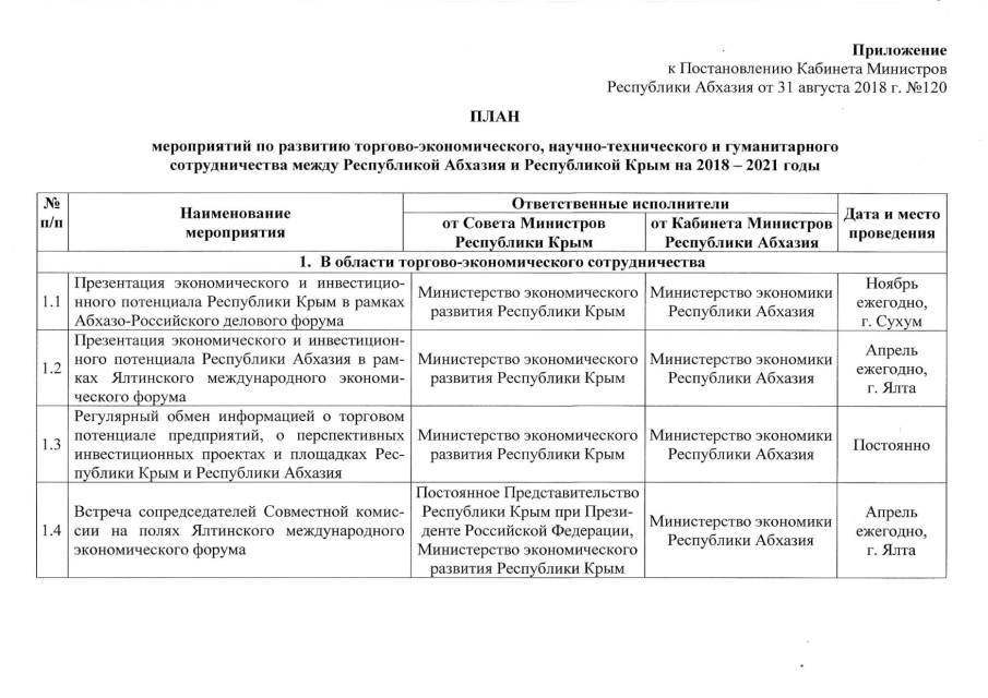 Постановление Кабинета Министров Республики Абхазия от 31.08.2018 № 120 "Об одобрении Плана мероприятий по развитию торгово-экономического, научно-технического и гуманитарного сотрудничества между Республикой Абхазия и Республикой Крым на 2018-2021 годы"