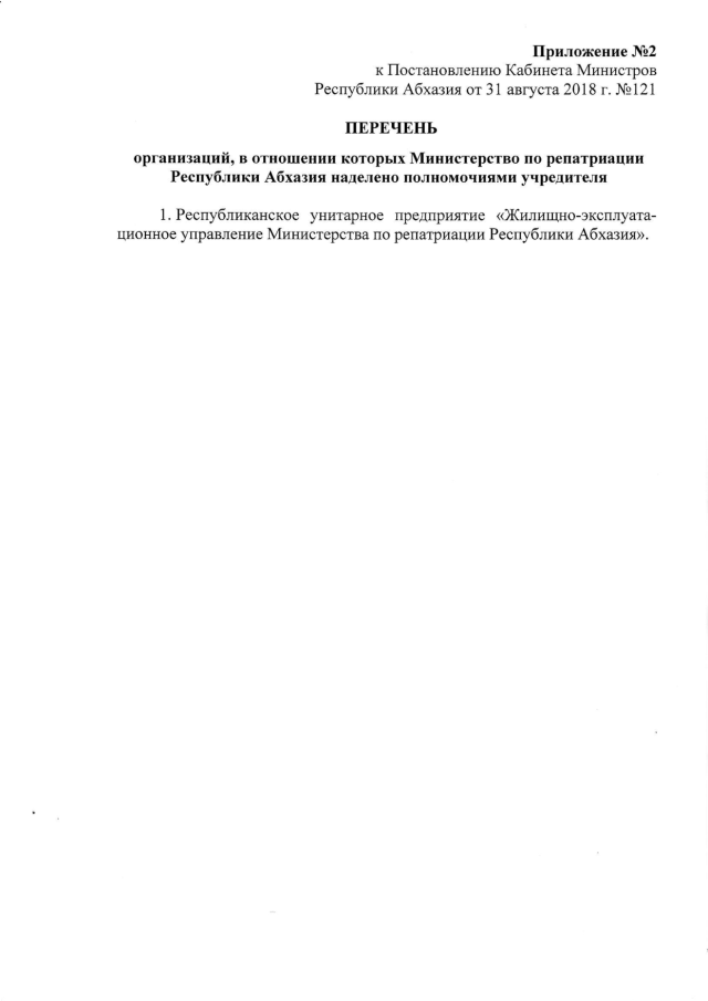 Постановление Кабинета Министров Республики Абхазия от 31.08.2018 № 121 "Об утверждении "Положения о Министерстве по репатриации Республики Абхазия"