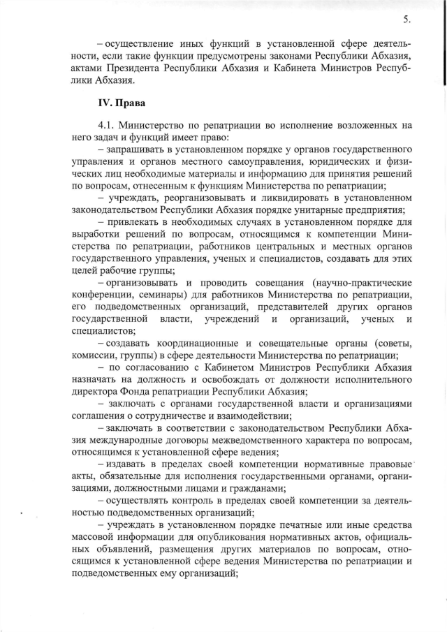 Постановление Кабинета Министров Республики Абхазия от 31.08.2018 № 121 "Об утверждении "Положения о Министерстве по репатриации Республики Абхазия"