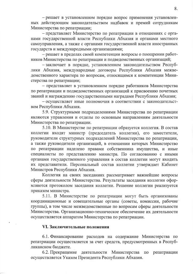 Постановление Кабинета Министров Республики Абхазия от 31.08.2018 № 121 "Об утверждении "Положения о Министерстве по репатриации Республики Абхазия"
