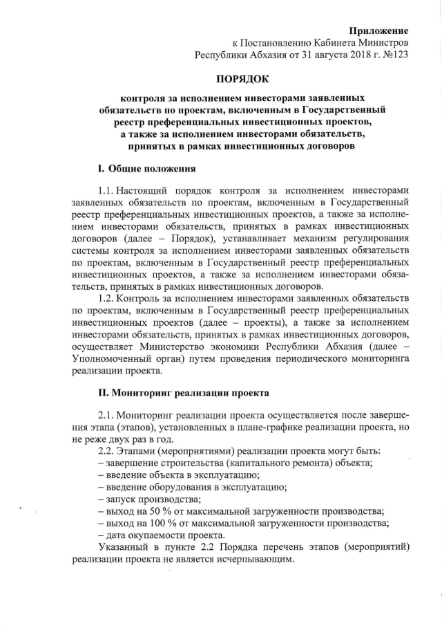 Постановление Кабинета Министров Республики Абхазия от 31.08.2018 № 123 "Об утверждении "Порядка контроля за исполнением инвесторами заявленных обязательств по проектам, включенным в Государственный реестр преференциальных инвестиционных проектов, а также за исполнением инвесторами обязательств, принятых в рамках инвестиционных договоров"