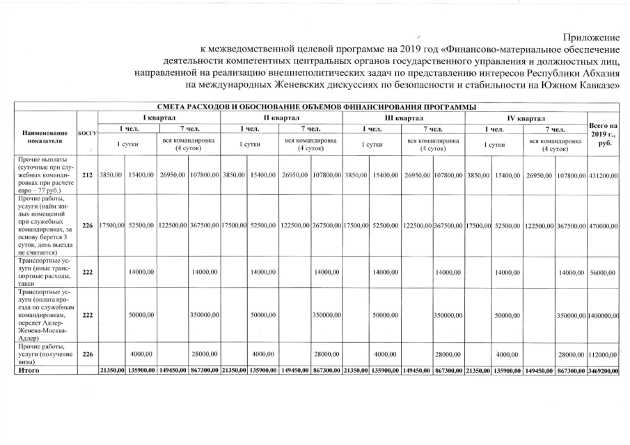 Постановление Кабинета Министров Республики Абхазия от 28.09.2018 № 137 "Об утверждении межведомственной целевой программы на 2019 год "Финансово-материальное обеспечение деятельности компетентных центральных органов государственного управления и должностных лиц, направленной на реализацию внешнеполитических задач по представлению интересов Республики Абхазия на международных Женевских дискуссиях по безопасности и стабильности на Южном Кавказе"