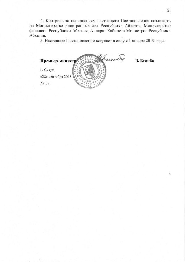 Постановление Кабинета Министров Республики Абхазия от 28.09.2018 № 137 "Об утверждении межведомственной целевой программы на 2019 год "Финансово-материальное обеспечение деятельности компетентных центральных органов государственного управления и должностных лиц, направленной на реализацию внешнеполитических задач по представлению интересов Республики Абхазия на международных Женевских дискуссиях по безопасности и стабильности на Южном Кавказе"