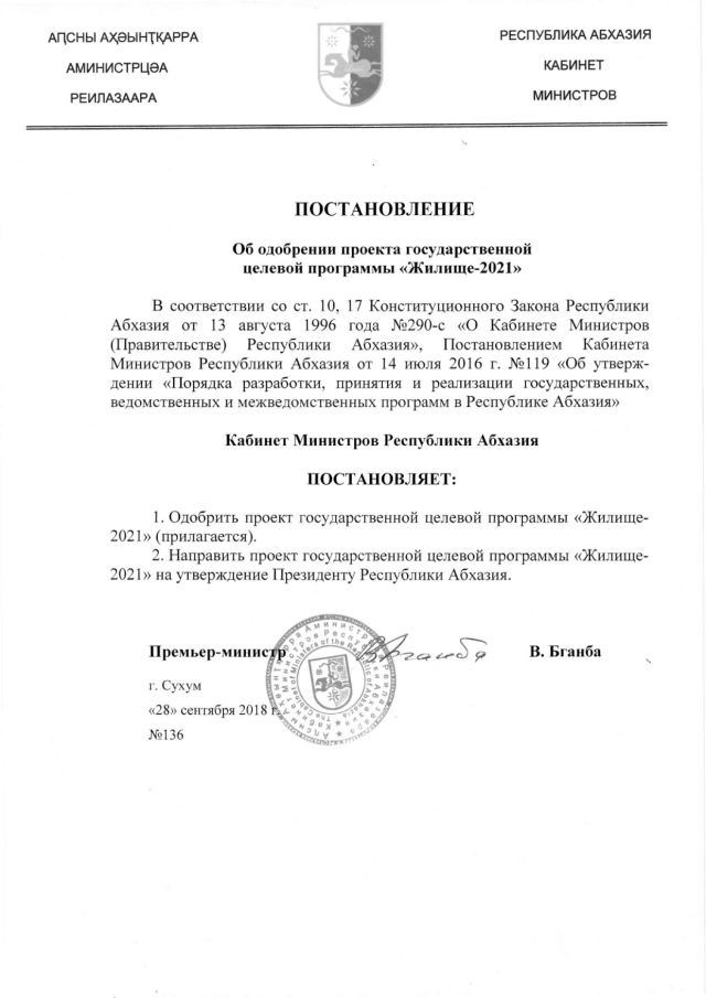 Постановление Кабинета Министров Республики Абхазия от 28.09.2018 № 136 "Об одобрении проекта государственной целевой программы "Жилище-2021"