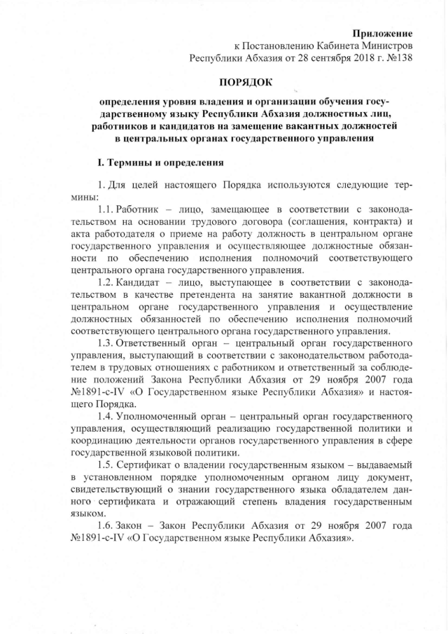 Постановление Кабинета Министров Республики Абхазия от 28.09.2018 № 138 "Об утверждении "Порядка определения уровня владения и организации обучения государственному языку Республики Абхазия должностных лиц, работников и кандидатов на замещение вакантных должностей в центральных органах государственного управления"